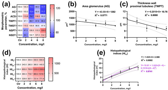 The linear regression model revealed a significant correlation between a number of D. rerio kidney and BPA concentration morphometric parameters (Figure 9a,d). Thus, the regression coefficient for the distal tubule wall thickness was 0.8080 (Figure 9c). In turn, the glomerular area had a smaller relationship with toxicant concentration (R2 = 0.5787; Figure 9b). A similar dependence was found for the other parameters. However, the application of the polynomial model did not demonstrate a more relevant regression coefficient.