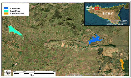 Three artificial basins located in the province of Palermo were selected for sampling: Lake Poma, Lake Scanzano and Piana degli Albanesi Lake (Figure 1). All the lakes analyzed have dams. The first is located in Partinico (37°59′17.45″ N–13°6′6.76″ E) at an altitude of 198 m above sea level (asl). It covers an area of approximately 268 hectares and has a perimeter of 11.1 km; the second is located in Piana degli Albanesi (hereinafter referred to as called Lake Piana, 37°58′20.54″ N–13°17′58.34″ E) at an altitude of 606 m asl, has an area of approximately of 289 hectares and a perimeter of 16.6 km; the third is located in Piana degli Albanesi (and only partially in the municipality of Monreale, 37°55′31.84″–13°22′7.55″ EN) at an altitude of 518 m asl, with an area of 101 hectares and a perimeter of 7.6 km. All three lakes are primarily situated in agricultural areas, with the water being used for both irrigation and to supply a number of urban centers with fresh water. The lakes are fed partly by rainwater and partly by influx from rivers [43].