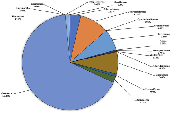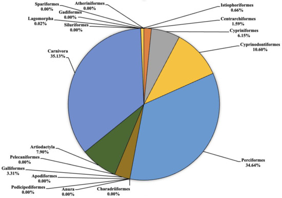 Regarding Lake Poma (Figure 2), the highest number of fragments concerned the orders of Atheriniformes (3.61%), Centrarchiformes (9.88%), Perciformes (7.31%), Galliformes (7.46%), Artiodactyla (2.12%) and Carnivora (66.43%). For the orders of Cypriniformes, Anura, Lagomorpha, Gadiforme and Istiophoriformes, no eDNA fragments were identified. Very low quantities of fragments were detected for Cyprinodontiformes, Apodiformes, Charadriiformes and Spariformes, recorded as 0.5 (0.01%), 10.5 (0.03%), 2 and 28 (0.3%), respectively. Finally, for the orders of Podicipediformes, Pelecaniformes and Siluriformes, low but noteworthy levels were found in the number of fragments, which were 37.5 (0.52%), 65.5 (0.90%) and 88 (1.21%), respectively.