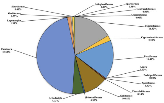 As regards to Lake Scanzano (Figure 4), the highest number of fragments concerned the orders of Cypriniformes, Cyprinodontiformes, Perciformes, Galliformes, Artiodactyla and Carnivora, which were equal to 495 (6.15%), 853.5 (10.60%), 2789 (34.64%), 266.5 (3.31%), 636 5 (7.90%) and 2829 (35.13%), respectively. Furthermore, in most cases, the number of fragments obtained was even greater than those obtained in Lake Piana. No eDNA fragments were identified for the orders of Atheriniformes, Anura, Podicipediformes, Apodiformes, Charadriiformes, Pelecaniformes, Gadiformes, Siluriformes or Spariformes. Lower amounts of fragments were found for Centrarchiformes and Istiophoriformes at 128 (1.59%) and 53 (0.66%) respectively. In conclusion, for Lagomorpha, the lowest quantities of fragments were detected, which was equal to two (0.02%). Compared to the other two lakes, there were a greater number of orders for which no eDNA fragments were identified. Several absent orders were found to be present in the other two lakes, such as Pelecaniformes, Artiodactyla, Apodiformes and Charadriiformes. An absence of Atherinifromes, Podicipedifromes and Siluriformes orders was also found in Lake Piana. The same was observed for Anura and Gadiformes when compared to Lake Poma.