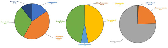 Results for aquatic species are detailed in Figure 5 and expressed as a percentage of fragments obtained. The highest fragment percentages in Lake Poma were obtained for species Micropterus salmoides, Perca fluviatilis, Atherina boyeri and Ameirus melas (43%, 31%, 16% and 10%, respectively). High fragment percentages in Lake Piana were observed in P. fluviatilis (47%) only. Discoglossus pictus, Cyprinus carpio and Gambusia holbrooki, not found in Lake Poma, showed fragment percentages of 0.14%, 47% and 6%, respectively. Finally, regarding Lake Scanzano, the highest fragment percentage was identified for Carassius auratus (75%), a species seemingly not present in the other two lakes. However, similar to Lake Poma, fragments of M. salmoides and A. boyeri were identified, albeit at lower percentages (24% and 0.72%, respectively), and similar to Lake Piana, fragments of C. carpio were found, although, once again, at much a lower percentage (0.16%).