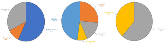 Other wildlife species for which eDNA fragments were detected in the three lakes are shown in percentages in Figure 6. A high fragment percentage were detected in Lake Poma for Podiceps cristatus (57%) and limited fragment percentages for Apus apus and Ardea cinerea at 10% and 33%, respectively. In Lake Piana, the highest fragment percentages concerned the species Lepus corsicanus (48%) and A. apus, although this last species was found at a higher rate (26%) than in Lake Poma. Similar to Lake Scanzano, fragments of A. cinerea and L. michahellis were also detected. In Lake Piana, however, detection rates were lower (17% and 9%, respectively), whilst in Lake Scanzano, these two species were the only fragments identified (61% and 39%, respectively).