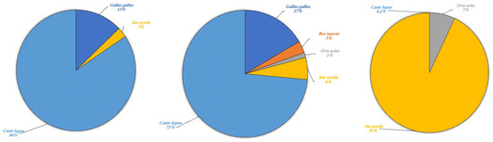 Likewise, in Lake Piana, the highest fragment percentage was recorded for C. lupus (73%) and lower percentages for G. gallus (17%) and S. scrofa (3%). However, fragments of B. taurus and O. aries were also detected in Lake Piana at 3% and 1%, respectively. Lastly, in Lake Scanzano, a high fragment percentage was detected only for S. scrofa (93%), with lower percentages recorded for O. aries and C. lupus at 7% and 0.1%, respectively.