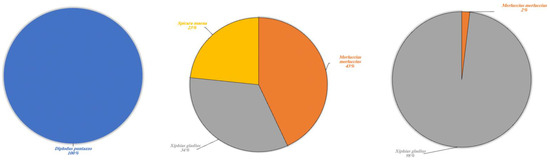 To conclude, a fascinating result concerned the detection of eDNA fragments of typically marine species (Figure 8). In Lake Poma, Diplodus puntazzo was detected at a rate of 100%, whilst Merluccius merluccius and Xiphias gladius were detected in Lake Piana and Lake Scanzano at differing percentages. In more detail, rates were found to be 43% and 34%, respectively, in Lake Piana and 2% and 98% in Lake Scanzano. Moreover, fragments of Spicara maena (23%) were only detected in Lake Piana.