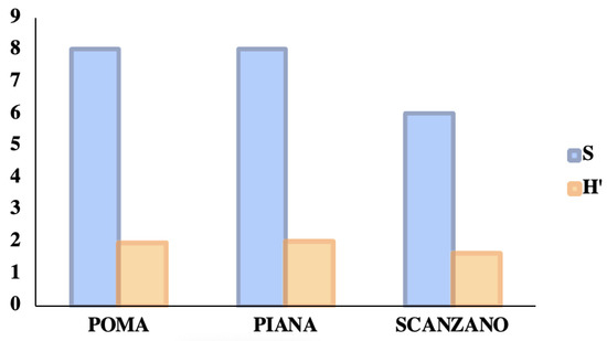 A comparison between the number of taxa and the values of the biodiversity index (relative to wild vertebrates) in three lakes. In detail, the specific richness values (S) and the biodiversity indices (H′) calculated with the Shannon algorithm.