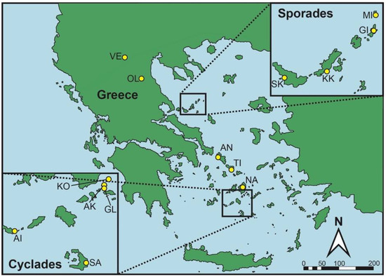 - Pafilis, P.; Foufopoulos, J.; Sagonas, K.; Runemark, A.; Svensson, E.; Valakos, E.D. Reproductive biology of insular reptiles: Marine subsidies modulate expression of the “island syndrome”. Copeia 2011, 2011, 545–552. [Google Scholar] [CrossRef]