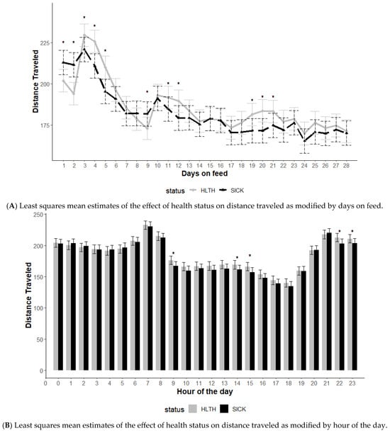 Least squares mean distance traveled from the generalized model with fixed effects for the interaction between health status and days on feed (A) and health status and hour of the day (B). The model included effects to control for clustering due to repeated measures on individual animals within the pen and study site. Each * signifies a significant difference (p < 0.05) within the day or record hour between health status categories.