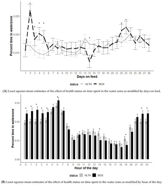 Least squares mean time spent in the water zone from the generalized model with fixed effects for the interaction between health status and DOF (A) and health status and hour of the day (B). The model included effects to control for clustering due to repeated measures on individual animals within the pen and study site. Each * signifies a significant (p < 0.05) difference within the day or record hour between health status categories.