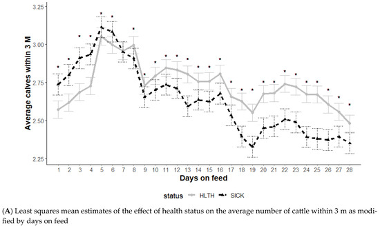 Least squares mean average number of cattle within 3 m from the generalized model with fixed effects for the interaction between health status and DOF (A) and health status and hour of the day (B). The model included effects to control for clustering due to repeated measures on individual animals within the pen and study site. Each * signifies a significant (p < 0.05) difference within the day or record hour between health status categories.
