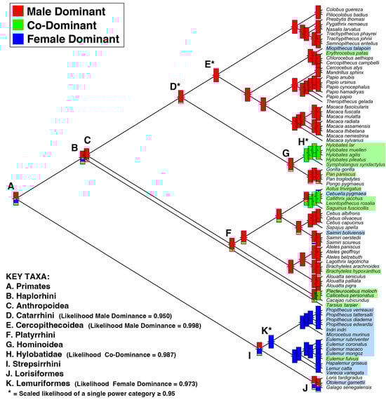 Intersexual power is highly variable in primates. Colored boxes indicate type of intersexual power reconstructed for ancestral nodes in the ASR analysis of discrete power categories. In each box, the width of the color band (red = male dominant, green = co-dominant, blue = female dominant) is proportional to the scaled likelihood of each power category occurring at the node. The character state of a clade’s last common ancestor (LCA) is unambiguous when the box is a solid color. Extant taxa with non-male-biased power are highlighted on the right (green = co-dominant, blue = female dominant). Key nodes are identified by capital letters. * identifies nodes with a scaled likelihood of ≥0.95 of a single power category occurring at the node. Male-biased power is more likely in the LCA of Anthropoidea, while female-biased power is more likely in the LCA of Lemuriformes. Greater uncertainty exists for the LCA of Primates, Strepsirrhini, and Haplorhini. If the LCA of Anthropoidea exhibited male-biased power (scaled likelihood = 0.844), then the various anthropoid taxa that do not exhibit male-biased power are probably derived and document >7 transitions to power that is not biased towards males.