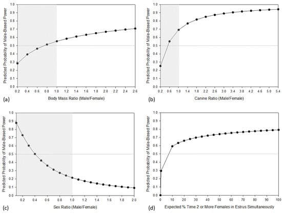 Our results are consistent with a growing body of literature indicating that power in animals is more than just dominance (sensu [2]). The social environment influences dyadic relationships. Power can arise from multiple different types of asymmetries in social relationships, such as dependency, inalienable resources, and knowledge, and hence is more complex than what might be expected based on inter-individual differences in fighting ability alone [2,3,84,85]. Indeed, we found that sex ratio—an extrinsic factor—was a strong predictor of intersexual power. Similarly, a study of Verreaux’s sifaka (Propithecus verreauxi) found that female leverage over males fluctuates with sex ratio [19]. Intersexual power in vervet monkeys (Chlorocebus pygerythrus) is dynamic and varies with sex ratio [103,104]. In spotted hyenas (Crocuta crocuta), patterns of sex-biased power partly emerge from sex differences in coalitionary support [15], that in turn derive from sex-biased dispersal [16]. Future research should explore the explanatory value of these and other social factors in primate power structures. Moreover, spotted hyenas exhibit low dimorphism, low estrous synchrony, and a female-biased power structure [105,106], suggesting that our model based on primates (Figure 4) may have broader applicability.