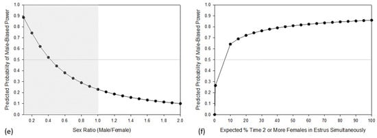 Predicted probabilities of male-biased power. The predicted probability of male-biased power increases with increasing dimorphism in (a) BMR and (b) CR. Similarly, the predicted probability of male power is ≥50% when (c) the sex ratio is greater than about 0.4 and (d) estrus is almost entirely asynchronous. The potential effect of female leverage increases only very slightly when extremely dimorphic species are excluded (e,f). Note that these predicted probability plots include extrapolations outside the range of x-axis values observed in primates. In our dataset (Table S1), BMRs of extant primates range from 0.85 in Indri indri to 2.45 in Mandrillus sphinx, and CRs of extant primates range from 0.88 in Propithecus edwardsi to 5.18 in Mandrillus sphinx. The horizontal gray line indicates the 50% probability threshold on the y-axis. Grey boxes highlight female-biased dimorphism (a,b) or female-biased sex ratios (c,e).