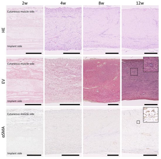 In the histological sections stained with H&E at 2 weeks (Figure 2), loose and fragile tissues were observed with scarce cells, and several edematous and cell-free areas occupied the tissues. At 4 weeks, the tissue thickness was almost the same as that at 2 weeks, but the number of cells and density of the CNTs tended to increase. As shown in Supplementary Figure S2, fibrin fibers were detected in the edematous area at 2 and 4 weeks using phosphotungstic acid–hematoxylin staining. The thickness, cell number, and density of the CNTs increased remarkably after 8 and 12 weeks, and cellular localization differed among the tissue positions, with the superficial and middle layers indicating tissues close to the implant and other tissues, respectively; the superficial layers tended to have more cells than the middle layer. Well-developed fiber structures were observed after 12 weeks. EV staining revealed the localization of elastic fibers in the CNTs; they were scarcely observed at 2 and 4 weeks and their proportion slightly increased from 8 to 12 weeks. In IHC, αSMA+ cells were detected in the fiber structures at 8 and 12 weeks and were observed across the organization.