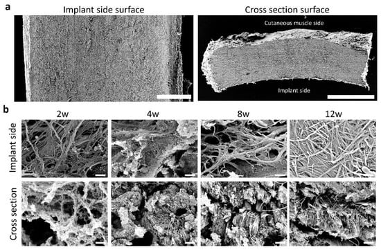 As shown in Figure 3a, the fiber arrangement was observed at the surface of the implant side or cross-section using scanning electron microscopy. On the implant-side surface (Figure 3b), the fibers were reticularly arranged, and the space between the fibers was wide between 2 and 8 weeks. At 12 weeks, a dense reticular arrangement of fibers was observed. On the cross-sectional surface, loose fiber bundles were observed at 2–4 weeks, which became dense at 8 and 12 weeks.