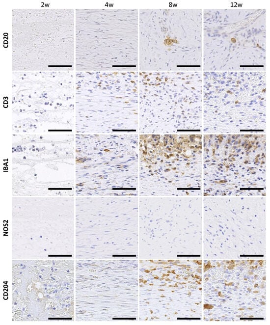 Infiltration of immune cells to the connective tissues formed around the embedded resin implant. Cross-sections of the connective tissues. Immunohistochemistry for CD20, CD3, IBA1, NOS2, and CD204. w: weeks after embedding. The upper direction of panels shows the superficial layers. Bars = 50 μm.