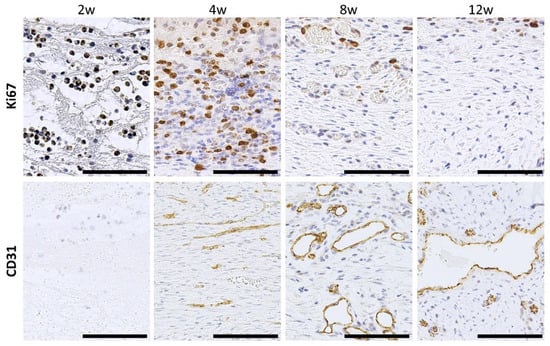 Ki67+ proliferating cells were present throughout the observation period and unevenly localized in the superficial layers (Figure 5). CD31+ endothelial cells were rarely observed at 2 weeks, but positive reactions were observed from 4 weeks onward. At 4 weeks, samples showed linear positive reactions without lumen formation; however, vascular lumen formation was clearly observed at 8 weeks, and expansion of the lumen was observed at 12 weeks.