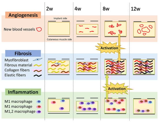 In this study, we assessed CNT formation around implanted materials to establish a technique for using CNT formed by FBRs as xenografts. Our results showed unique implant-related CNT formation. The CNT formation process is illustrated in Figure 6. Following implantation, an edematous-like structure containing non-collagenous fibers partially composed of fibrin was formed in its internal space for 2 weeks. Further, angiogenesis was virtually absent, and cellular infiltration was minimal. From 2 to 4 weeks, the number of myofibroblasts and macrophages in the CNTs simultaneously increased, forming a vascular-like structure with no lumen. The number of collagen fibers increased significantly with the elastic fiber area from 4 weeks. At 8 weeks, CNT formation stabilized and neovascular vessels with visible lumens were observed. The tissues at 12 weeks showed inflammatory cells in the superficial layers; however, the neovascular lumen was enlarged in the middle section. These results may contribute to our understanding of FBR-related tissue remodeling.