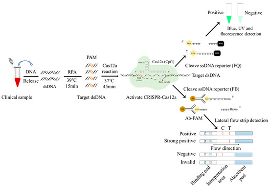 - Chen, J.; Huang, Y.; Xiao, B.; Deng, H.; Gong, K.; Li, K.; Li, L.; Hao, W. Development of a RPA-CRISPR-Cas12a Assay for Rapid, Simple, and Sensitive Detection of Mycoplasma hominis. Front. Microbiol. 2022, 13, 842415. [Google Scholar] [CrossRef]