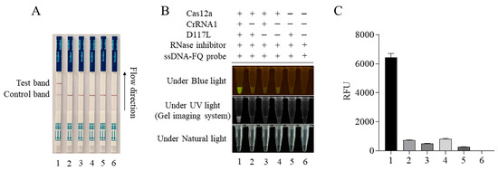 ASFV D117L-crRNA1-mediated CRISPR/Cas12a-LFS. The CRISPR/Cas12a reactions were set up in different samples of 1–6, as indicated in panel (B). The Cas12a reactions were subjected to lateral flow strip (LFS) detection (A) and also verified by blue light and UV light detection (B), as well as fluorescence detection (C).