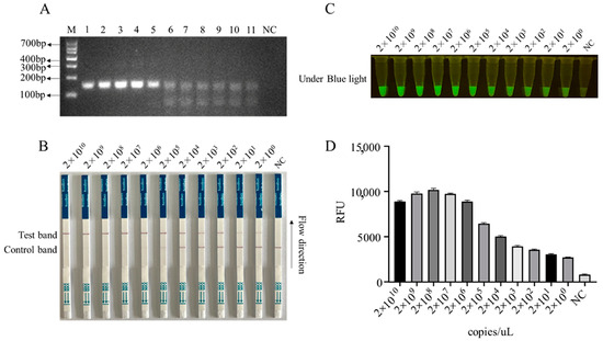 The sensitivity of RPA-CRISPR/Cas12a-LFS detection. (A) RPA products of D117L amplified from pCold-I-D117L with gradient concentrations from 2 × 1010 copies/uL to 2 × 100 copies/uL (sample Nos. 1–11), with NC denoting negative control. The Cas12a-LFS detection of sensitivity was presented in (B) and also verified by blue light detection (C) and fluorescence detection (D).