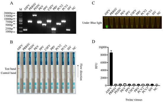 The specificity of CRISPR/Cas12a-LFS detection. (A) The specific gene PCR products of nine swine viruses as indicated were verified by 2% agarose gel electrophoresis. The NC denotes negative control. The specificity of Cas12a-LFS detection was presented in (B) and also verified by blue light detection (C) as well as fluorescence detection (D).