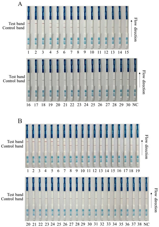 We preliminarily tested for ASFV in a first batch of clinical samples (30 samples) by RPA-Cas12a-LFS, and the results showed that 8 of the 30 clinical samples were positive (Nos. 1–8), and 22 were negative (Nos. 9–30) (Figure 6A). Further, we tested a second batch of clinical samples (38 samples) with RPA-Cas12a-LFS detection for ASFV. The results showed that 10 out of 38 clinical samples were strongly positive (Nos. 1–10); three were weakly positive (Nos. 11–13); and 25 were negative (Nos. 14–38) (Figure 6B). In order to verify the reliability of the test strip for detecting ASFV, the quantitative PCR (qPCR) recommended by WOAH was used for verification detection [26]. The results showed that RPA-Cas12a-LFS detection was completely consistent with qPCR detection (Figure 6 and Table 1), indicating a 100% coincidence rate of the two methods and further confirming the reliability of the RPA-Cas12a-LFS detection method.
