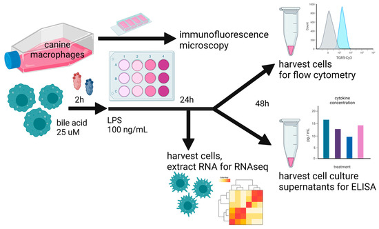 Overall study design, whereby cultured canine macrophages (MH588 cells) were plated in a 24-well plate, incubated with bile acid at 25 μM, and stimulated with LPS (lipopolysaccharide) 2 h later. After 48 h of co-culture, cells were immunostained for flow cytometry, and supernatants were harvested for cytokine analysis. For the RNAseq portion of the analysis, cells were harvested for RNA extraction after 24 h of co-culture.