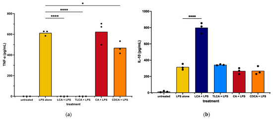 TNF-α (a) and IL-10 (b) concentrations in supernatants from canine macrophages (MH588) treated with bile acid at 25 μM, incubated for 2 h, then stimulated with LPS (lipopolysaccharide) at 100 ng/mL. Values were compared with one-way ANOVA with the Holm–Sidak multiple comparison test. Horizontal bars with asterisks indicate significantly different mean values compared to control treatment of LPS alone; * p < 0.05 and **** p < 0.0001.