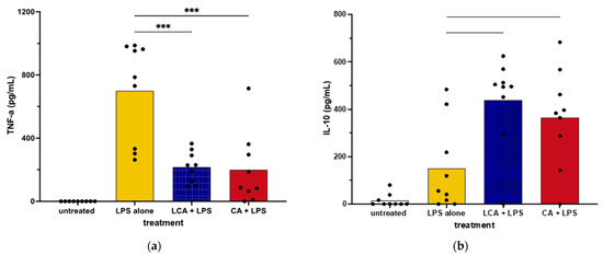 TNF-α (a) and IL-10 (b) concentrations in supernatants from monocyte-derived macrophages from healthy dogs treated with bile acid at 25 mM, incubated for 2 h, then stimulated with LPS (lipopolysaccharide) at 100 ng/mL. Values were compared with one-way ANOVA with the Holm–Sidak multiple comparison test. Horizontal bars with asterisks indicate significantly different mean values compared to control treatment of LPS alone; CA—cholic acid, LCA—lithocholic acid, *** p < 0.0001.