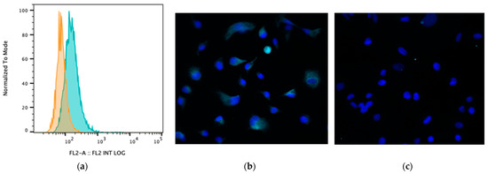 (a) Cell surface TGR5 expression (bile acid receptor) by MH588 cells (canine macrophage cell line) as assessed using flow cytometry. The different shadings represent different stains; orange is isotype control (rabbit IgG), and green is antibody of interest. (b) Fluorescence micrographs of MH588 cells at 20× magnification with unconjugated anti-TGR5 antibodies (1:50 dilution) compared to (c) staining with rabbit isotype control.