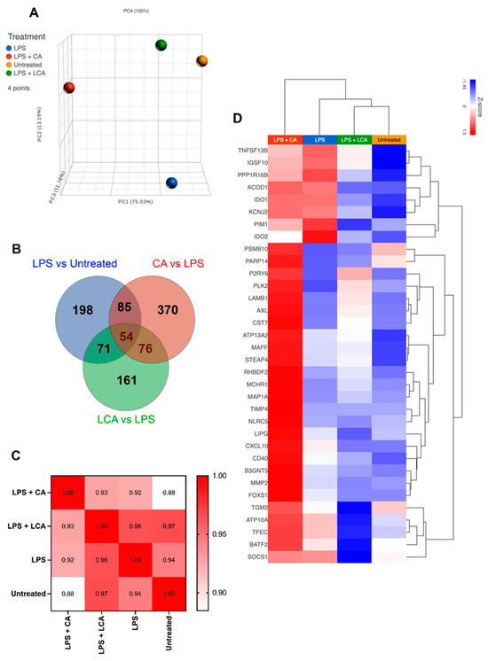 Transcriptomic analysis of LPS-activated macrophages treated with CA or LCA (LPS—lipopolysaccharide, CA—cholic acid, LCA—lithocholic acid). Macrophages were incubated with LPS and BAs (bile acids) for 24 h, then RNA was extracted for RNAseq, as described in Methods. (A) Principal component analysis plot showing differences in transcriptome by distance. (B) Venn diagram showing overlapping gene sets using differentially expressed genes defined with an arbitrarily determined p value of 0.05. (C) Pearson correlation of similarities between samples. (D) Heat map hierarchical clustering of M1 genes upregulated in CA compared to LCA and untreated. Gene set was extrapolated from 250 M1 genes defined in Chow et al.’s 2022 study of in vitro differentiated canine macrophages [30].