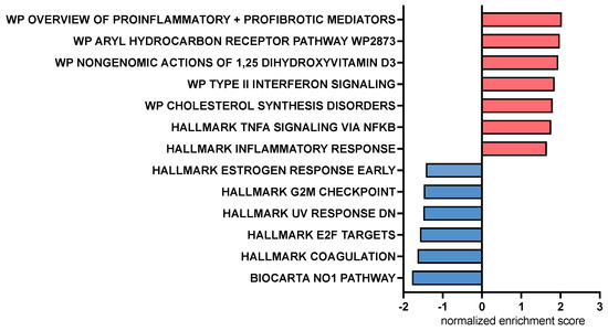 Bar chart representing pathway analysis results based on Gene Set Enrichment Analysis comparing canine macrophages exposed to CA (cholic acid, 25 μM) to those exposed to LCA (lithocholic acid, 25 μM) 2 h prior to stimulation with LPS (lipopolysaccharide, 100 ng/mL). Red bars indicate pathways upregulated by CA compared to LCA, and blue bars indicate pathways downregulated by CA compared to LCA. All displayed pathways were significantly differentially expressed with an FDR-adjusted p value < 0.2.