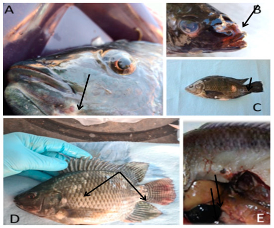 External lesions in Nile tilapia (Oreochromis niloticus) affected by an infectious disease. (A): nodules in the mandibular region, (B): ulceration in the head region, (C): ulcer on the lateral body surface, (D): loss of scales, (E): gallbladder distention and liver congestion.