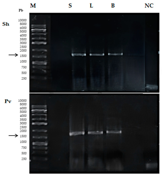 Amplicons of the 16S rRNA gene obtained by endpoint PCR. M, molecular marker (16S rRNA gene). PCR products are shown from DNA extracted from bacterial colonies from spleen (S), liver (L) and blood (B) samples (cultured on BBA) of fish challenged with S. haemolyticus (Sh) and P. vermicola (Pv) NC: negative control (DNase-free distilled water). The black arrow indicates the amplicon size (~1300 bp).