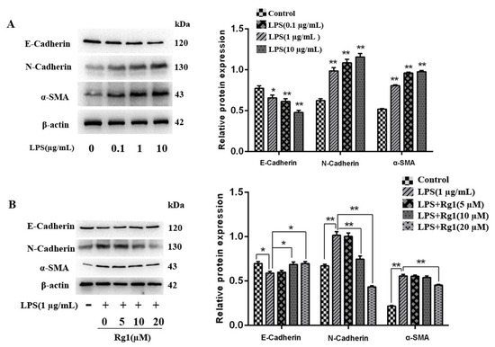 Ginsenoside Rg1 inhibits LPS-induced EMT progression in BEND cells. (A) BEND cells undergo 48 h of processing using LPS (0.1, 1, and 10 μg/mL). Proteins related to EMT (α-SMA, E-cadherin, and N-cadherin) (n = 3) were detected via Western blotting. (B) BEND cells are stimulated with LPS (1 μg/mL) and/or ginsenoside Rg1 at the concentrations required for 48 h. EMT-associated proteins N-cadherin, E-cadherin, and α-SMA (n = 3) were examined through Western blotting, with β-actin as the loading control. The mean ± SEM is adopted to express values; ** p < 0.01 and * p < 0.05 vs. the control group.