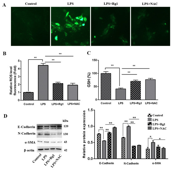 In order to verify whether ginsenoside Rg1 can reduce ROS generation in LPS-stimulated BEND cells, ROS staining and glutathione (GSH) were used to detect ROS fluorescence signals. The results in Figure 2A–C indicated that ROS was strongly positive in the LPS group compared with the control group, while it was weakly positive in groups treated with ginsenoside Rg1 and ROS inhibitor NAC (p < 0.01), and GSH content presented the opposite trends in those groups (p < 0.01). For the purpose of validating whether ginsenoside Rg1 alleviates LPS-induced fibrosis in BEND cells by inhibiting ROS production, fibrosis factors were detected. As shown in Figure 2D, by contrast to the LPS group, E-cadherin rose significantly in the ginsenoside Rg1 group and NAC group in terms of expression (p < 0.01). However, the ginsenoside Rg1 group and NAC group displayed apparently lowered N-cadherin and α-SMA expressions (p < 0.05).