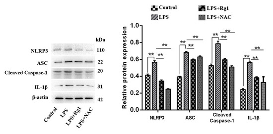 For the purpose of validating whether ginsenoside Rg1 inhibits NLRP3 activation by reducing ROS in BEND cells, the expression of NLRP3, ASC, caspase-1, and IL-1β in different groups was detected. The LPS group had distinctly higher expressions of these factors than the control group (p < 0.01) (Figure 3). However, such factors significantly decreased in the ginsenoside Rg1 and NAC groups in comparison with those in the LPS group regarding expression (p < 0.01).