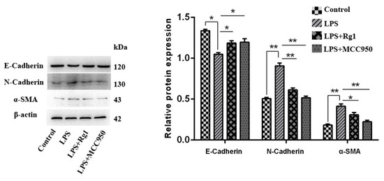In order to verify whether ginsenoside Rg1 alleviates the fibrosis of BEND cells by inhibiting NLRP3, fibrosis factors were detected. As shown in Figure 4, the ginsenoside Rg1 and MCC950 groups displayed prominently raised E-cadherin expression (p < 0.05) but substantially lowered N-cadherin, as well as α-SAM expression, compared to the LPS group (p < 0.05).