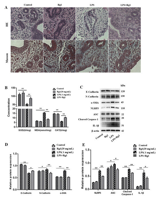 Ginsenoside Rg1 alleviates endometrial fibrosis in mice by inhibiting ROS-activated NLRP3. The control group (no treatment), the ginsenoside Rg1 group (100 mg/kg ginsenoside Rg1 treatment), the model group (with LPS), and the ginsenoside Rg1-treated group (with 100 mg/kg ginsenoside Rg1 + LPS) are set for the enrolled mice. (A) Uterine tissues undergoing H&E and Masson staining. (B) SOD, MDA, and CAT content obtained from uterine tissues. (C–E) α-SMA, E-cadherin, NLRP3, ASC, N-cadherin, caspase-1, and IL-1β (n = 3) were examined using Western blotting, for which the loading control was determined as β-actin. The mean ± SEM is adopted to describe values; ** p < 0.01 and * p < 0.05 vs. the control group.