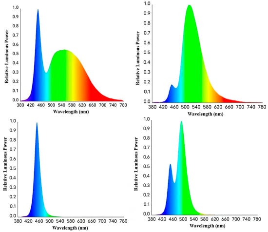 Spectral characteristics: (A) white light-emitting diode light (WL); (B) green light-emitting diode light (GL); (C) blue light-emitting diode light (BL); (D) blue-green light-emitting diode light (BGL).