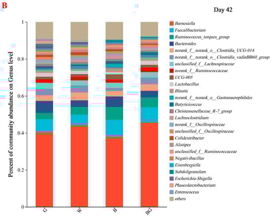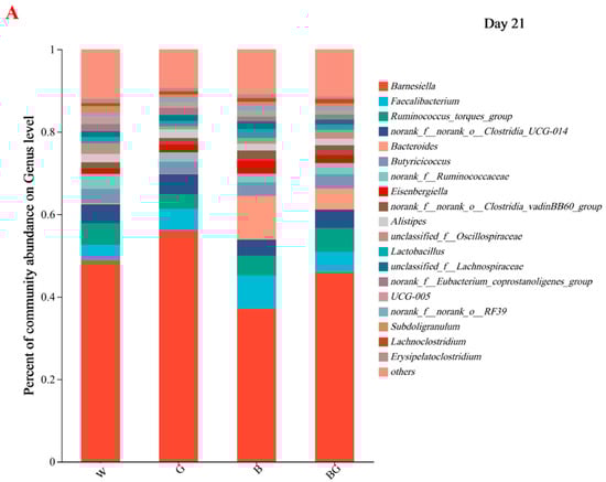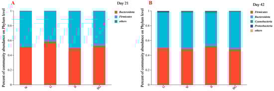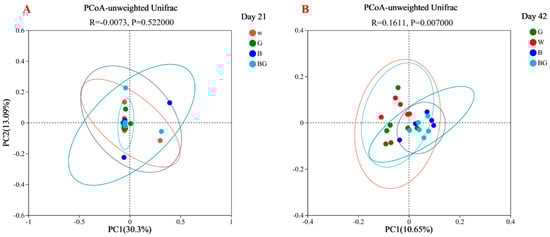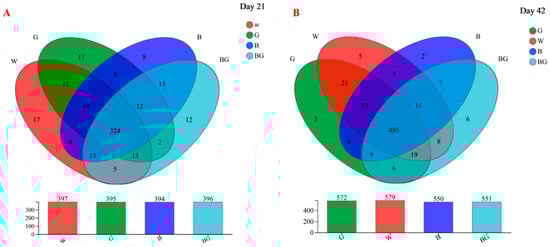 Illumina Miseq sequencing of the 338F—806R regions of bacterial 16S rRNA genes generated 10,524,203 and 1,129,642 high-quality sequences at day 21 and day 42, respectively. Four hundred and sixty-five OTUs (day 21) and 618 OTUs (day 42) were obtained, respectively (basis of 97% sequence similarity). As shown in the Venn diagram about day 21, we identified 324, which appeared to be present in all the samples. The W group had 397 OTUs, with 17 unique OTUs; the G group had 395 OTUs, with 11 unique OUTs; the B group had 394 OTUs, with 8 unique OTUs. The BG group has 396 OTUs, with 12 unique OTUs (Figure 2A). On day 42, we observed that 485 OTUs were shared across all treatments. The W group had 579 OTUs, with 5 unique OTUs; the G group had 572 OTUs, with 3 unique OUTs; the B group had 550 OTUs, with 2 unique OTUs. The BG group had 551 OTUs, with 6 unique OTUs (Figure 2B).