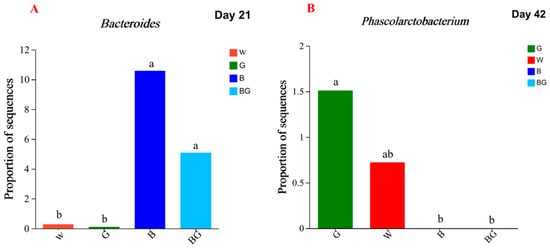 A total of 118 genera were detected on the experimental day 21 and 133 genera on day 42, respectively. At day 21, 19 genera with relative abundance greater than 0.1% were found (Figure 5A). Except for Bacteroidetes (p = 0.011, p-adjust = 1.000), there was no significant difference in the cecal microbial community at the genus level among the four groups (p > 0.05). The relative abundance of Bacteroides in the cecum at the genus level of the BG group was significantly higher than that of the G group and the W group (p < 0.05, Figure 6A) but not significantly different from the B group (p > 0.05, Figure 6A). At day 42, 26 genera with relative abundance greater than 0.1% were found (Figure 5B). Only Phascolarctobacterium showed a tendency to differ between the four groups (p = 0.006, p-adjust = 0.818). The relative abundance of Phascolarctobacterium in the cecum at the genus level of the G group was significantly higher than that of the B group and the BG group (p < 0.05, Figure 6B), but not significantly different from the W group (p > 0.05, Figure 6B). There was no significant difference in Phascolarctobacterium among the B group, BG group, and W group (p > 0.05, Figure 6B). No phascolarctobacterium was found in the B group or the BG group.