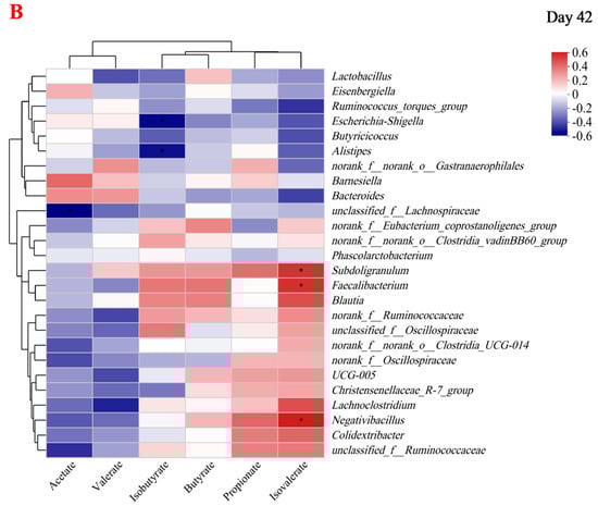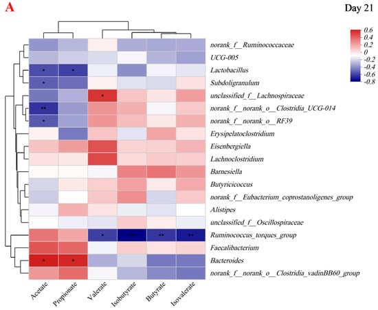Heatmap of the Spearman correlations between the cecal microbiota and short-chain fatty acid on day 21 (A) and on day 42 (B). * p < 0.05 (Significant); ** p < 0.01 (Extremely significant); *** p < 0.001 (The most significant).