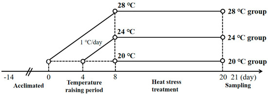 Experimental treatment protocols. Temperature control Day −14 to 0: Temperature was controlled at 20 °C with the heating rods during acclimatization. Day 1 to 8: Temperature was raised to 24 °C and 28 °C with the heating rods at 1 °C/d. Day 9 to 20: the temperature of the three groups was maintained at 20 °C, 24 °C and 28 °C, respectively, using the heating rods. Day 21: Heating ended, and samples collected. The group with a pre-sampling temperature of 20 °C is the 20 °C group. The group with a pre-sampling temperature of 24 °C is the 24 °C group. The group with a pre-sampling temperature of 28 °C is the 28 °C group.