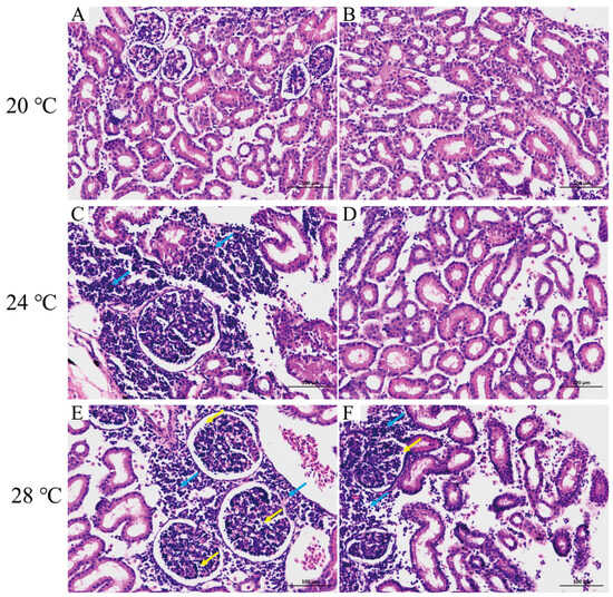 Histopathology of A. baerii kidney under heat stress. Control group ((A,B): 20 °C); heat stress groups ((C,D): 24 °C, (E,F): 28 °C). Yellow arrow: lymphocytic infiltration in the glomerulus; Blue arrow: lymphocyte infiltration in the interstitium.