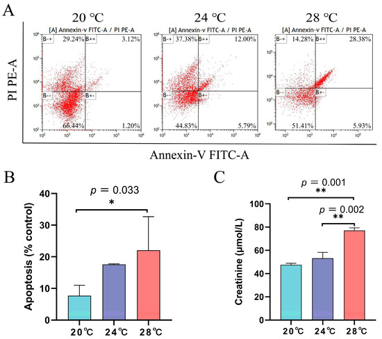 Heat stress led to apoptosis in kidney cells of A. baerii (A,B), along with an increase in plasma creatinine (C). Cell apoptosis was determined by flow cytometry after Annexin V-FITC/PI staining in kidney cells. The quantification data showed that apoptotic cell percentage was significantly higher after heat stress. * p < 0.05, ** p < 0.01, the detailed p-values are shown above.