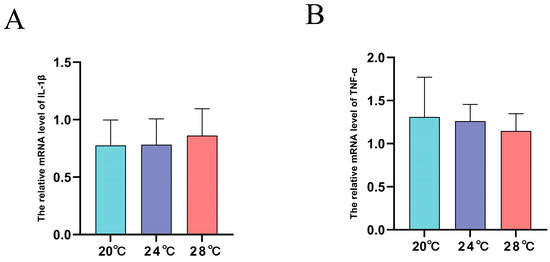 The expression of IL-1β mRNA was independent of temperature treatment (p > 0.05) (Figure 4A). In addition, the expression of TNF-α mRNA was also independent of temperature treatment (p > 0.05) (Figure 4B).