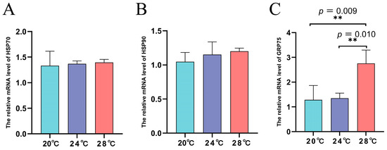 As temperature increased, expression levels of GRP75 mRNA in the 28 °C group significantly increased compared to the control group (p = 0.009) (Figure 5C). However, there was no significant difference in the expression levels of HSP70 and HSP90 mRNA in the heat stress group compared to control group (Figure 5A,B).