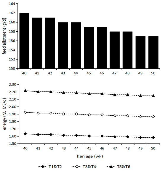 The energy standard for laying hens at onset of lay is 11.50 MJ/kg (NY/T33-2004 [7]). High-energy diets can significantly promote broiler growth (13.38 MJ/kg) [8]. In 5-week-old laying hens, dietary high energy (13.01 MJ/kg) can promote bone development and improve lipid metabolism [9]. However, it has been reported that broiler chickens would still be able to attain market weight when fed with a less-dense nutrient diet in the starter phase, followed by a high-energy diet in the finisher phase [10]. And, existing studies have found that restricted feeding increases egg production, average egg weight and hatchability in broiler breeders [11,12,13]. During the early and peak laying periods, fat synthesis and consumption in hens are in dynamic balance [14]. As the hen ages and liver function decreases, fat is deposited excessively, resulting in fatty liver hemorrhagic syndrome (FLHS). And not only that, but fat is denatured, which is one of the main causes of cardiovascular disease [15]. The increase in mortality in the late egg-laying period is closely related to lipid metabolism. The energy level in the diet determines the body weight of the hen during the laying period. Dietary restriction can solve the problem of excessive fat deposition in broilers and hens to a certain extent, and promote their growth and laying performance [16]. In contrast, high-energy diets not only increase feeding costs, but may also induce fat deposition and reduce egg production [17].