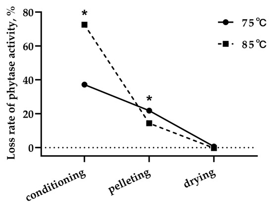 Loss rate of phytase activity during the steam conditioning–pelleting and cooling process. * Significant differences between treatments.